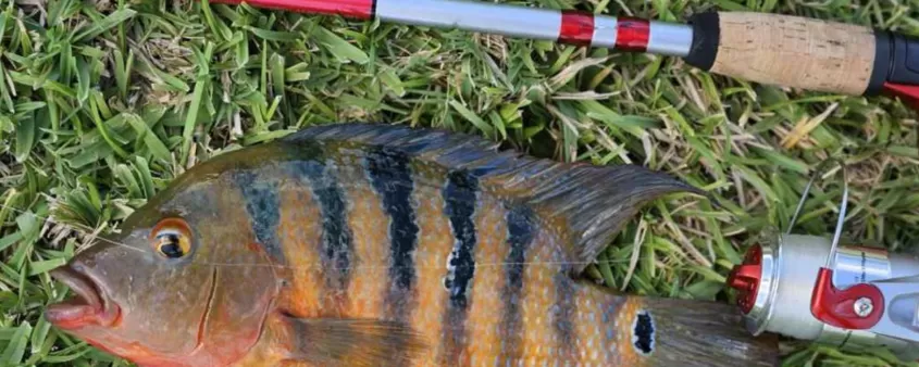 GET SPINNING: A department store spinning rod and reel is an inexpensive way to get in the game, and the nearest action may be found in the parking lot pond. Exotic Mayan cichlids like this have spread to almost all of the Fort Myers area's fresh waters.